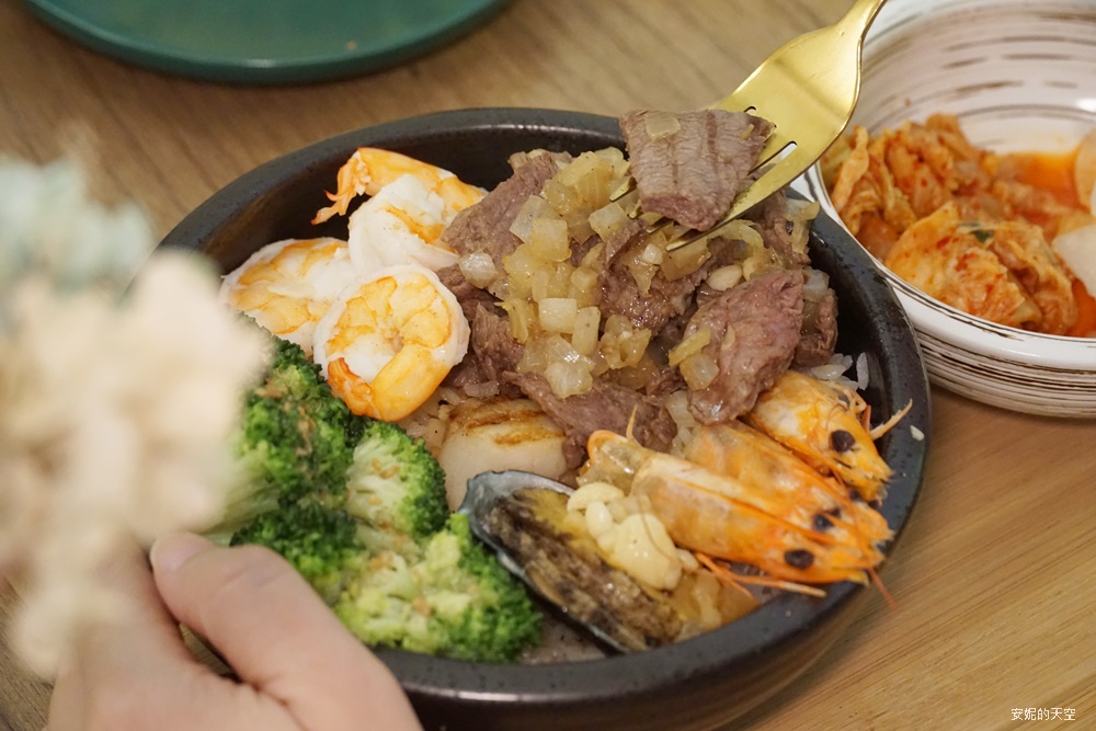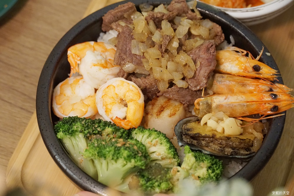 來自日本的生食級干貝,香煎至金黃後仍保有柔嫩甜味;來自東北角的一整顆鮑魚豪邁上桌,咬下去的瞬間充滿滿足感。三隻飽滿白蝦已貼心去殼、去腸泥,吃起來特別安心又爽口。就連肉食控也會被征服,因為碗裡還放上了滿滿的嫩煎牛肉,香氣濃郁、口感多汁。旁邊搭配上以胡麻醬調味的花椰菜,清爽又解膩。