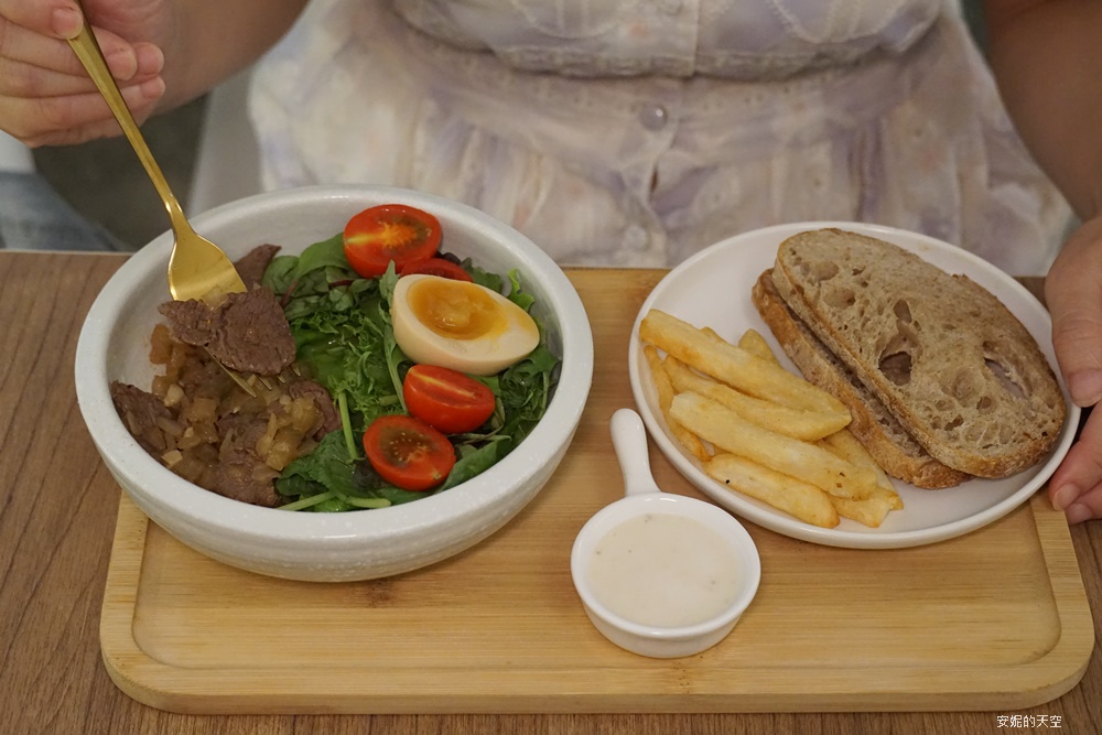 這道酸種麵包搭配嫩肩牛排的餐點也是人氣餐點,選用美國的嫩煎牛,用奶油香煎,保留牛肉原本的風味,口感帶有嚼勁,最喜歡的是這裡的生菜搭配,是選用我最喜歡的芝麻葉、小菠菜、番茄等時令生菜(小松菜、京水菜、芝麻葉、甜菜、紅芥菜、萵苣等輪替交換),搭配上凱薩醬,單吃就很爽口,沾醬更有不一樣的風味。