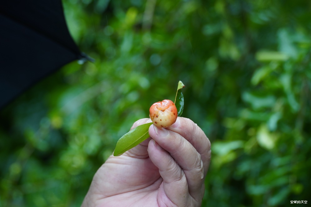 他指著路旁的肖楠,講述它在山林間散發淡淡香氣的特性,又拿起一片蓮霧樹葉,讓大家聞聞那股獨特的果香。就連藏身在樹叢中的野生櫻桃,也逃不過他的眼睛,被他巧妙地發現並介紹。