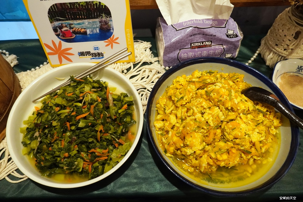 這天的餐點是由店主以及碇內社區共同準備的料理,用共好的概念,碇內內地區的特色,在這裡完美呈現,有暖呼呼的藥膳湯品、薑黃飯、山藥、鮮蝦、黃金泡菜、紅麴、牛肉醬、雞肉等,還有手工的奶酪,每一道都讓我們讚不絕口,也感受到暖暖社區的溫暖人情味。
