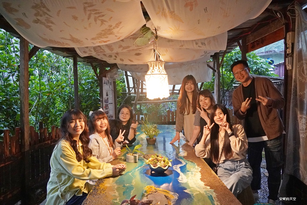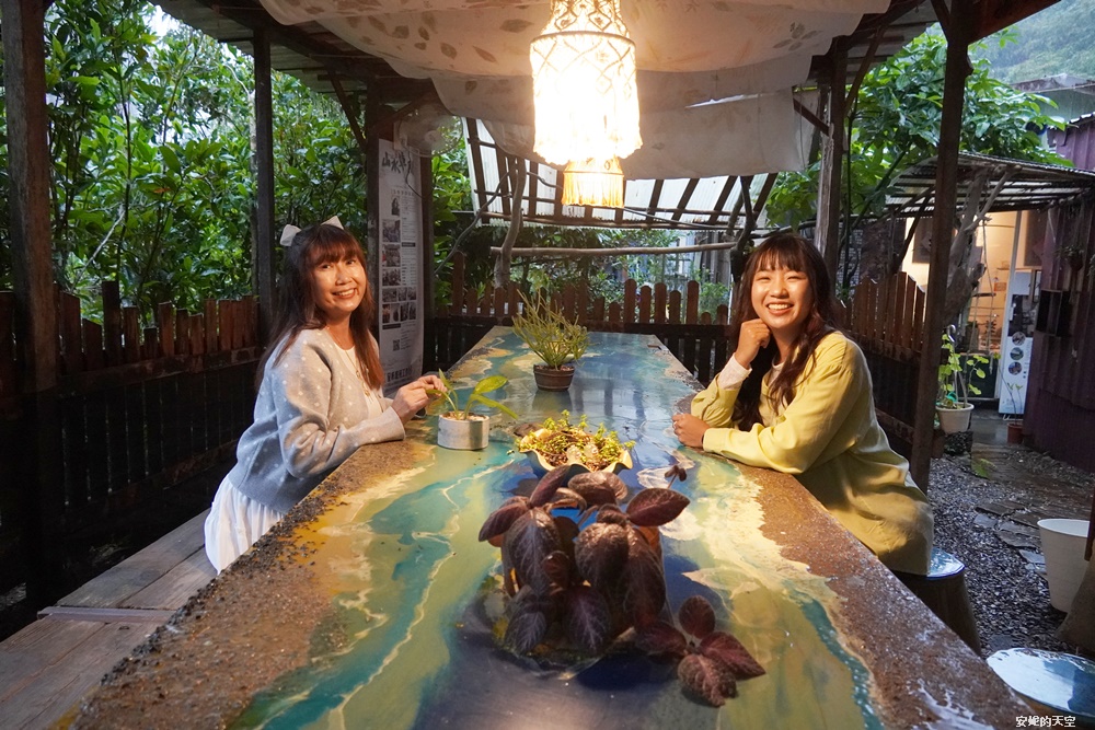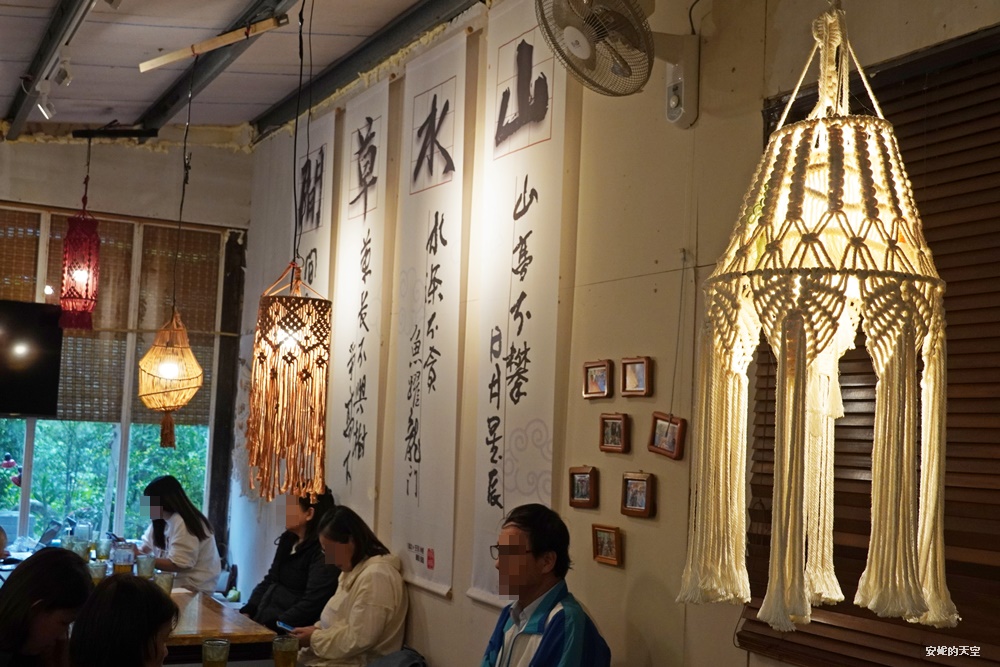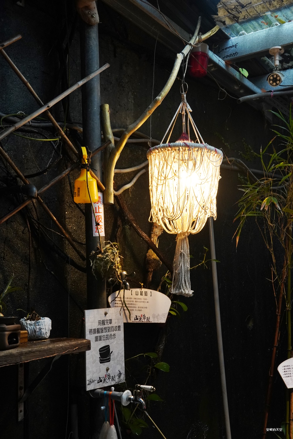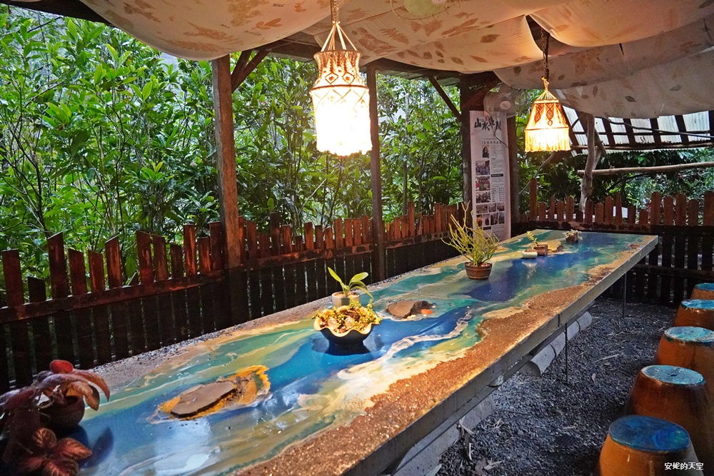 山水草間還有一處非常迷人的綠色空間,桌椅都充滿手作巧思:桌面彩繪精美,椅子則由陶罐改造後再彩繪而成。這個半露天場地在晴朗的日子特別適合作為用餐區,搭配輕柔的帷幕與溫暖的燈飾,更增添了浪漫而悠閒的氛圍,彷彿置身於自然與藝術交織的秘密花園。