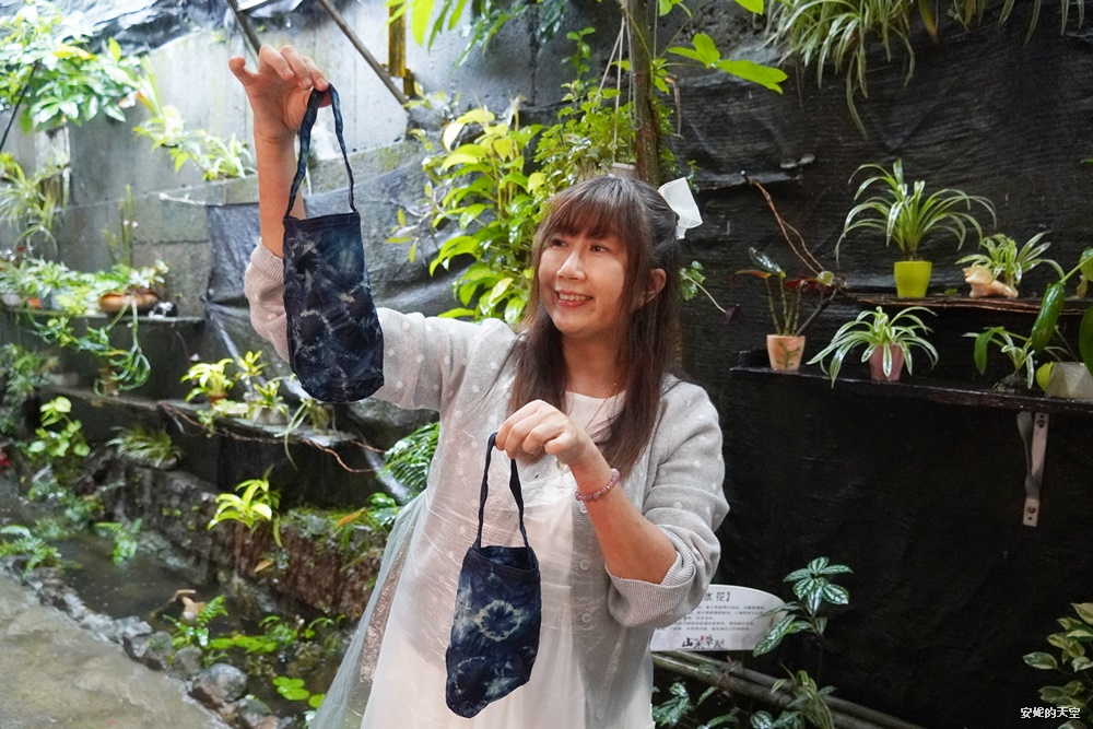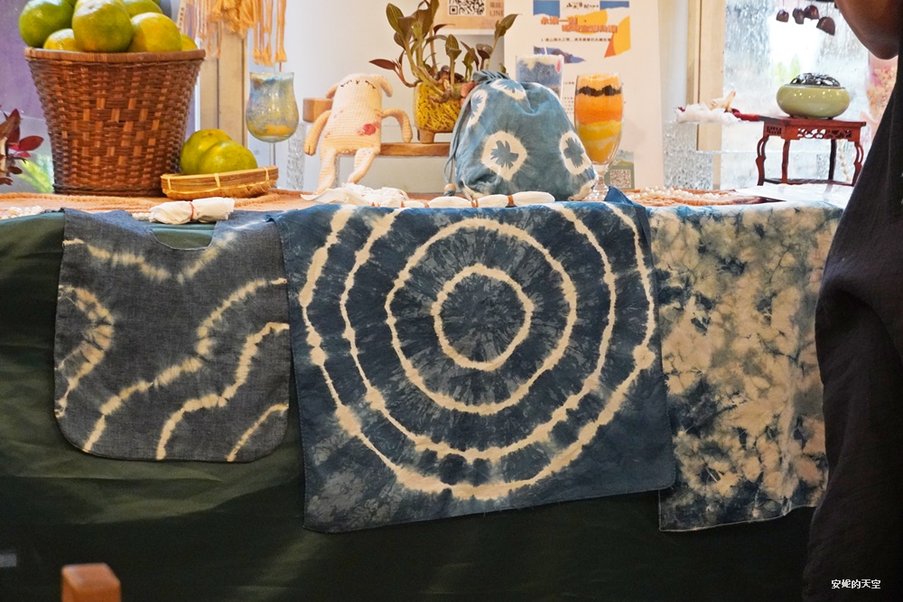 大菁則是暖暖的另一項特色。這次我們體驗了大菁藍染,用彈珠、冰棒棍綑綁出專屬圖案,再將布料浸入深邃的藍染染缸中,看著顏色一點點滲透、成形,完成屬於自己獨一無二的藍染作品。