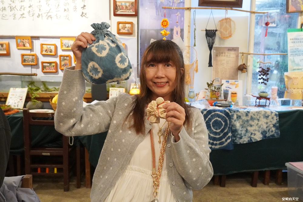 在這裡我學到超棒的藍染技巧,老師教我們用彈珠以及冰棒棍,作成球型或是特殊的線條,老師教法淺顯易懂,我覺得我的藍染工藝又更上一層樓了。