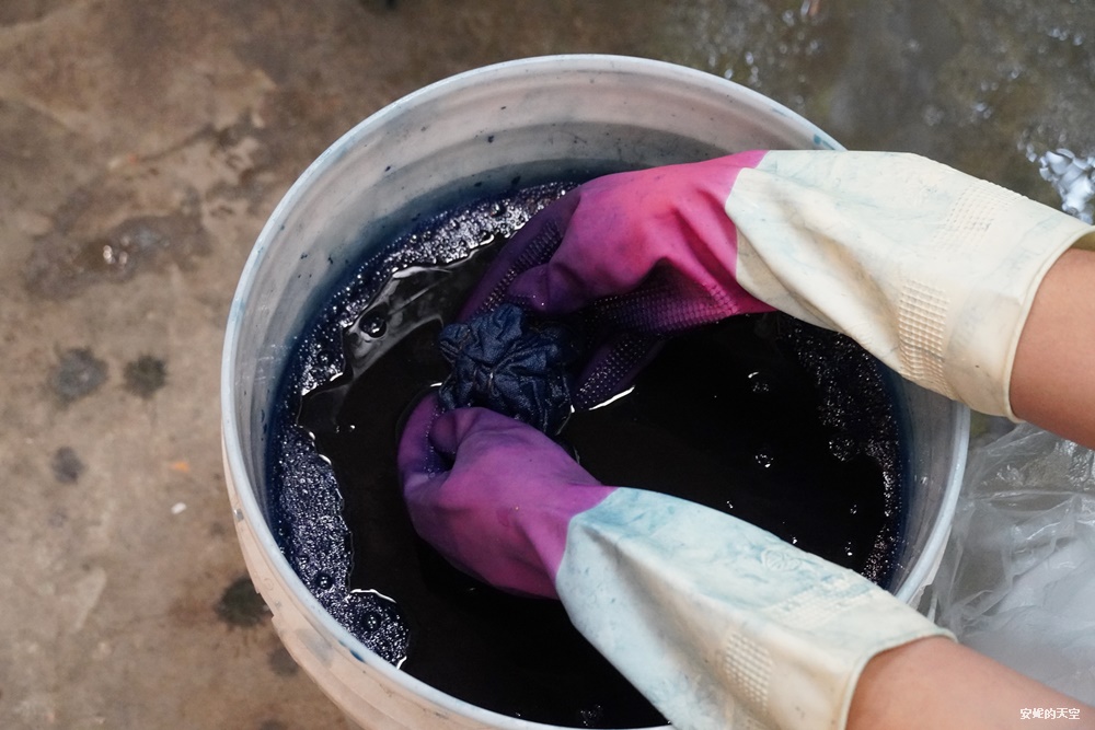 藍染的關鍵在於耐心與細心。每一塊布都需要先浸泡在染劑中約三分鐘,然後取出讓布料休息、氧化,再重複這個過程五次,才能完成獨特的藍色圖案。這種循序漸進的染布方式,不僅考驗技術,也讓人在操作中體驗到傳統工藝的韻味與樂趣。