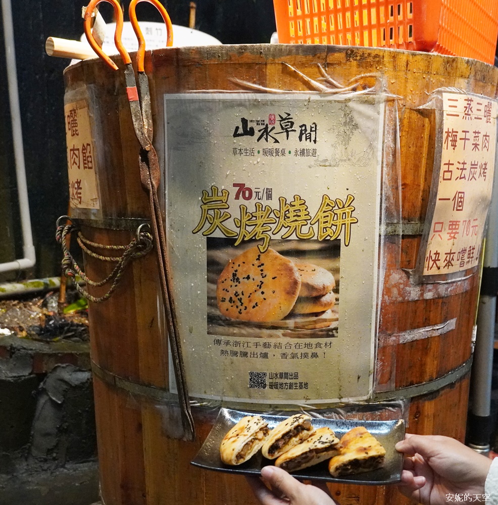 在山水草間,還有一項不可錯過的在地美食——炭烤燒餅。這道伴手禮傳承自浙江手藝,結合暖暖的在地食材,內餡包著經過三次醃漬、三次日曬的梅干扣肉。採用古法炭火慢烤,外皮香酥帶勁,咬下去可以感受到層次分明的口感。