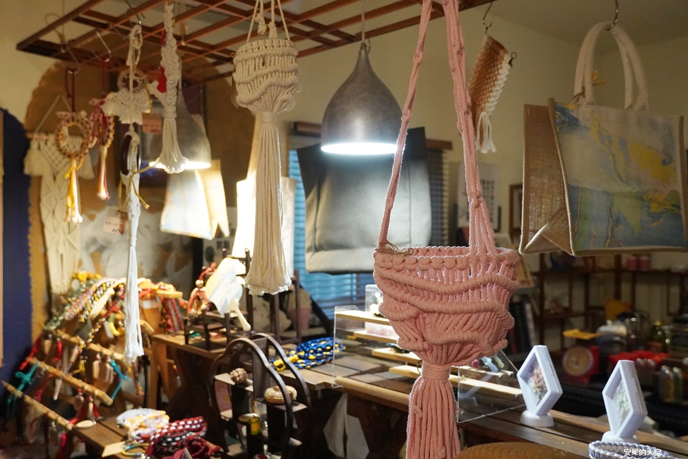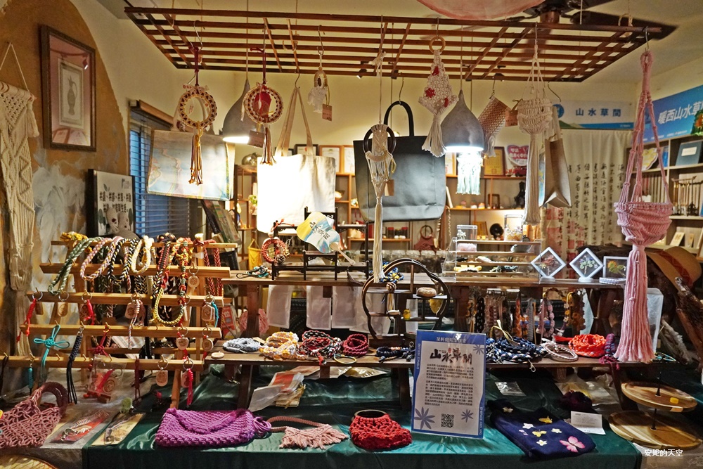 店主妻子小玉手作技藝高超,在園區裡有作品的陳列空間,這裡宛如一座小小的藝術殿堂,各式各樣的編織,包包手作、刺繡、書畫通通都有,作品之精緻讓人讚嘆。