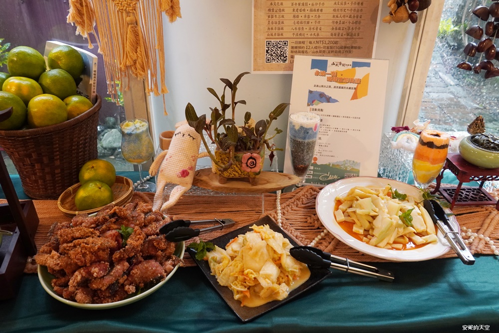 這天的餐點是由店主以及碇內社區共同準備的料理,用共好的概念,碇內內地區的特色,在這裡完美呈現,有暖呼呼的藥膳湯品、薑黃飯、山藥、鮮蝦、黃金泡菜、紅麴、牛肉醬、雞肉等,還有手工的奶酪,每一道都讓我們讚不絕口,也感受到暖暖社區的溫暖人情味。