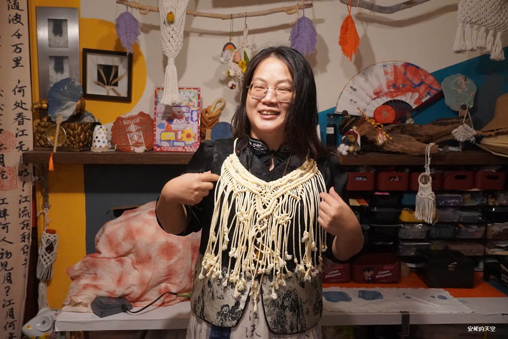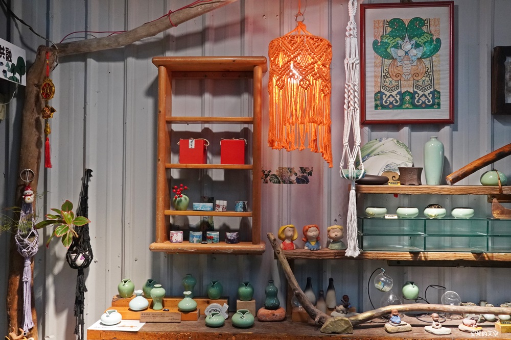 店主妻子小玉手作技藝高超,在園區裡有作品的陳列空間,這裡宛如一座小小的藝術殿堂,各式各樣的編織,包包手作、刺繡、書畫通通都有,作品之精緻讓人讚嘆。