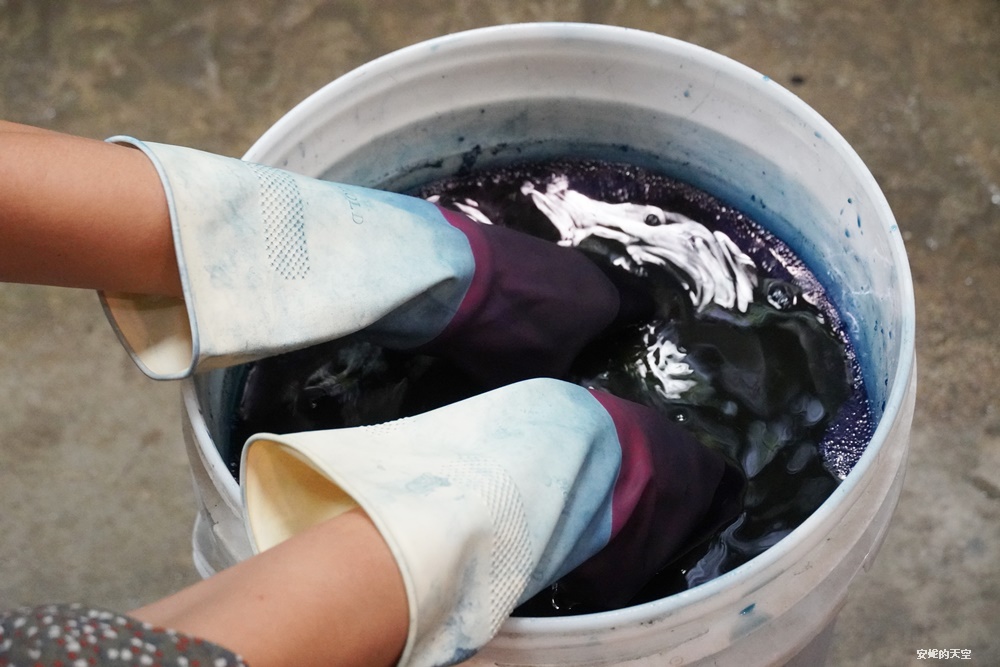 藍染的關鍵在於耐心與細心。每一塊布都需要先浸泡在染劑中約三分鐘,然後取出讓布料休息、氧化,再重複這個過程五次,才能完成獨特的藍色圖案。這種循序漸進的染布方式,不僅考驗技術,也讓人在操作中體驗到傳統工藝的韻味與樂趣。