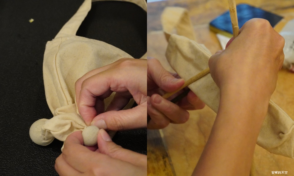 在這裡我學到超棒的藍染技巧,老師教我們用彈珠以及冰棒棍,作成球型或是特殊的線條,老師教法淺顯易懂,我覺得我的藍染工藝又更上一層樓了。