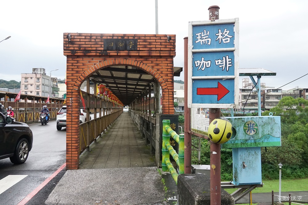 四腳亭的瑞慶橋行人走到還有屋頂的設計,出入口都是紅磚的拱門,瑞格咖啡在這裡有大大的指標,順著箭頭走就可以抵達。