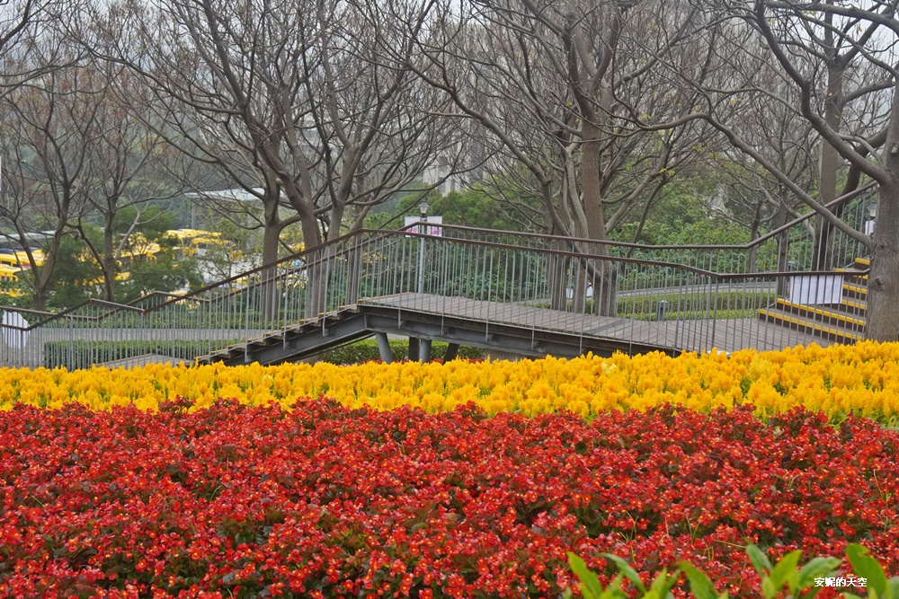 這裡與一般的公園有些不同,位居較高的山坡上,需走階梯而上才能看到滿山谷的花毯,沿著階梯而上金黃的樹葉好有冬日蕭瑟的情調,也是絕佳的拍攝地點。
