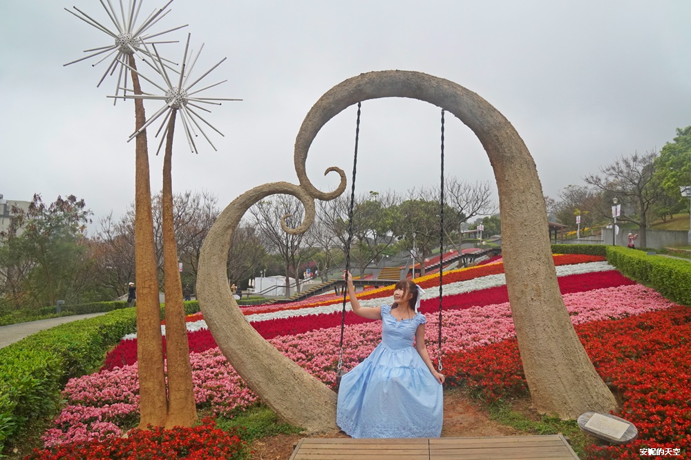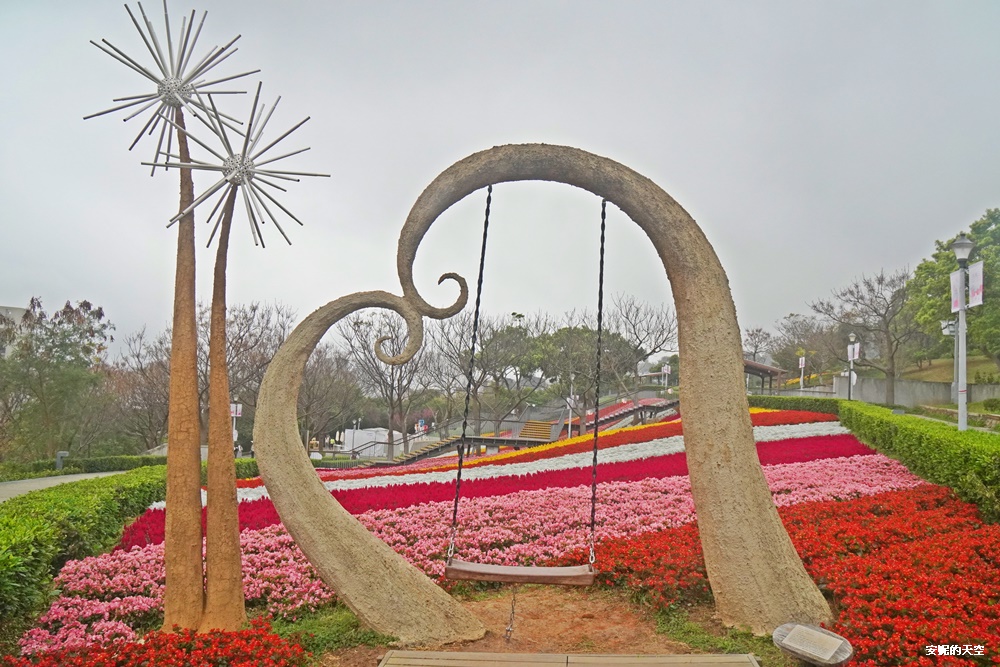 從鞦韆上往遠方望去,整片花毯盡收眼底,彷彿彩色地毯般鋪展在山坡上。這些春日花卉的顏色飽和鮮明,每一朵都被細心照料,整片花海看起來生機盎然,令人忍不住深呼吸,沉浸在春天的浪漫氛圍中。