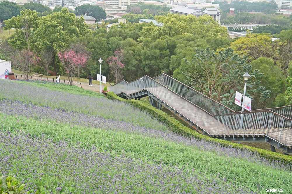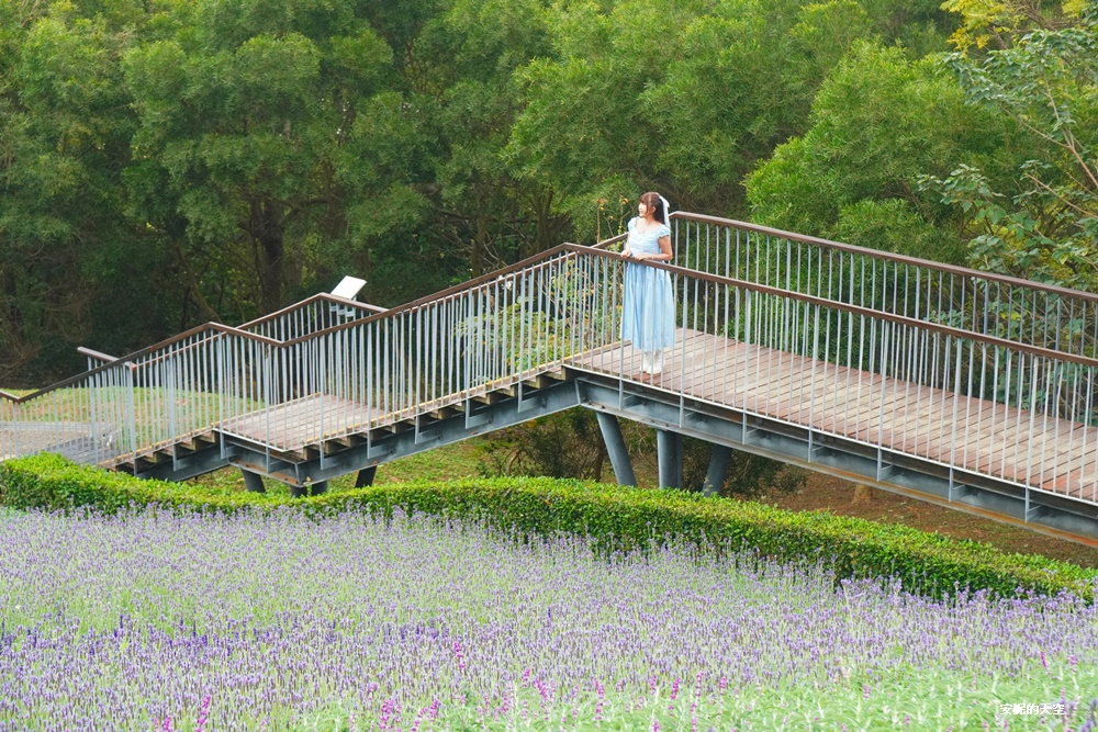 另外一側則種滿浪漫的紫色鼠尾草與薰衣草,整片花海散發出柔美而夢幻的氛圍。微風輕拂時,紫色花海隨風搖曳,像是一片浪漫的紫色雲海,讓人忍不住停下腳步細細欣賞。