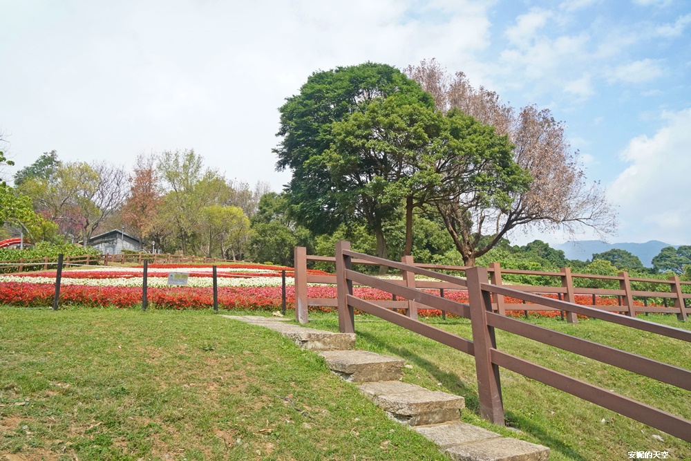 這裡的花田圍起了木柵欄,竟意外別有一番異國的情調,這一區花田不大,大約1分鐘就走完了,但別小看這座公園,往上走還有櫻花與花毯交織的夢幻景色喔。