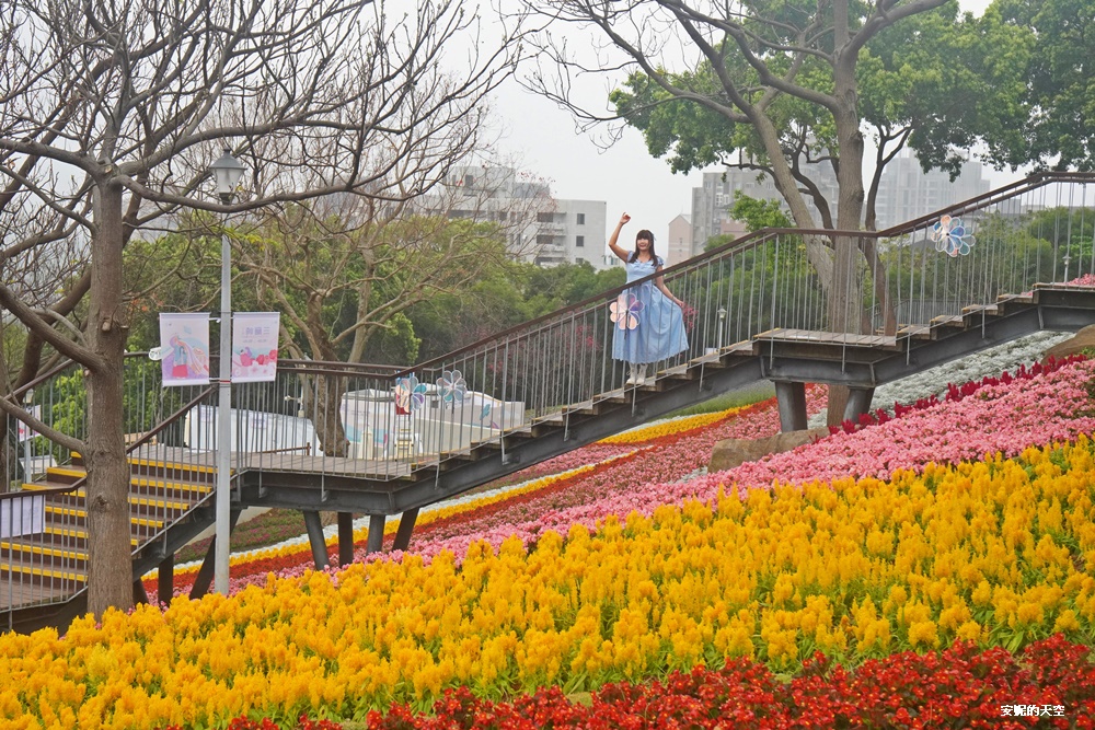 花毯之間的階梯步道兩側同樣被繽紛花田環繞,置身其中,彷彿走進色彩繽紛的花海世界。沿著步道慢慢散步,四周的花香與鮮豔色彩包圍,每一步都像踏入畫中,浪漫又療癒。