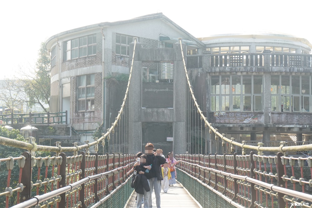 從十分車站到十分瀑布,會經過兩座吊橋,第一座吊橋【四廣潭吊橋】位在【十分幸福咖啡館】後方,吊橋橫跨基隆河支線溪流,整片溪水是夢幻的翠綠色,像是延伸至森林裡,走在橋上,可以俯瞰碧綠溪水與山谷岩壁,是一段走起來輕鬆的吊橋。
