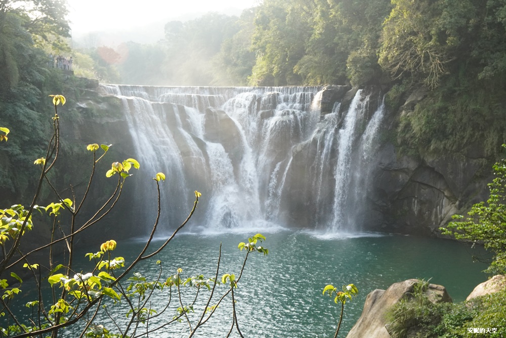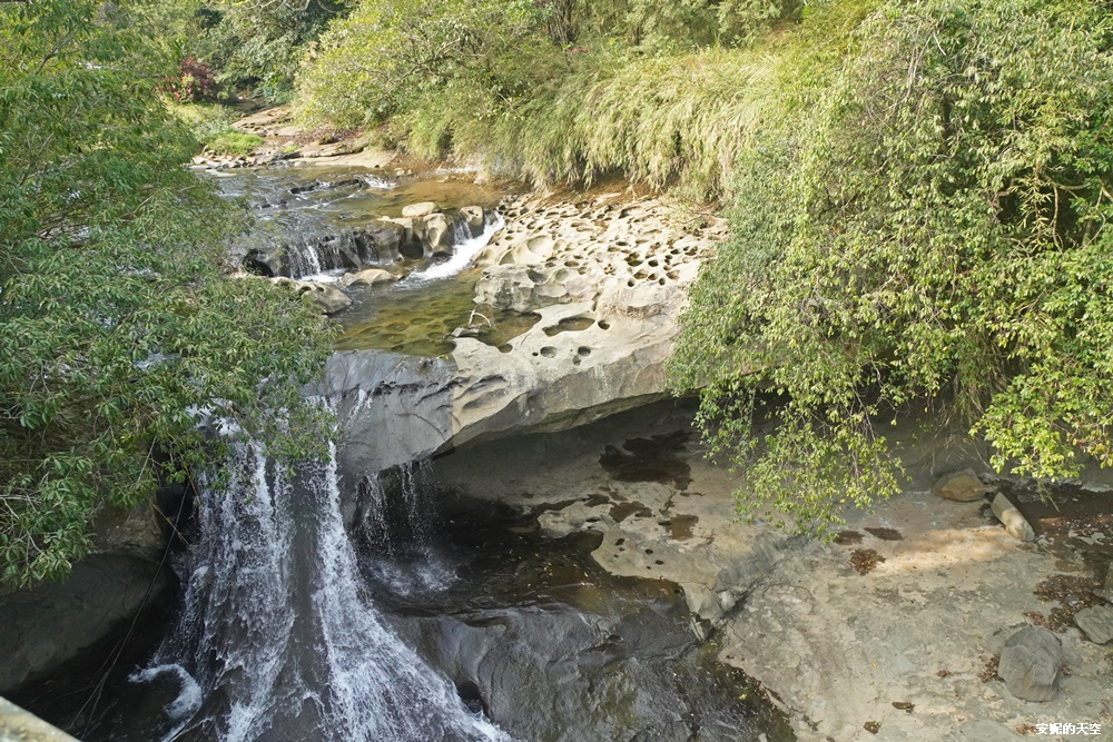 碧綠的溪水,經過岩石的激盪奔流,形成白色的磅礡水幕,注入到下層的溪流,又變成綠色的溪水,映照著山谷間的綠意,是十分瀑布獨有的畫面。