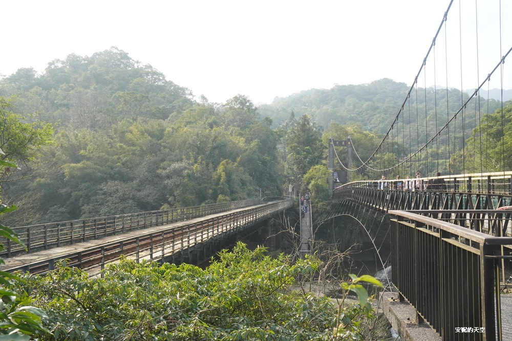 再往前行,是觀瀑吊橋,我很喜歡這一段,因為吊橋的另一側是鐵道,不時會有火車經過,也是鐵道迷的觀火車秘境,可以一次將鐵道與吊橋收藏。