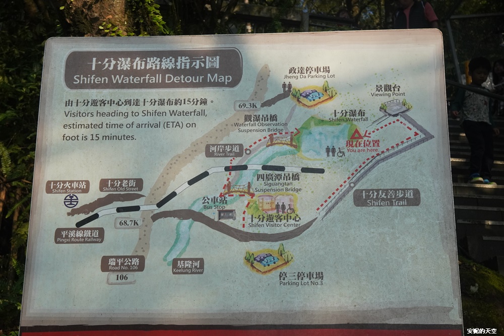 附上十分瀑布的路線指示圖,讓大家可以一目了然路線,安妮從十分車站到十分瀑布,沿途都是吊橋與階梯,對推車族較為不友善,但還算是個很輕鬆宜人,適合闔家光臨的景點。