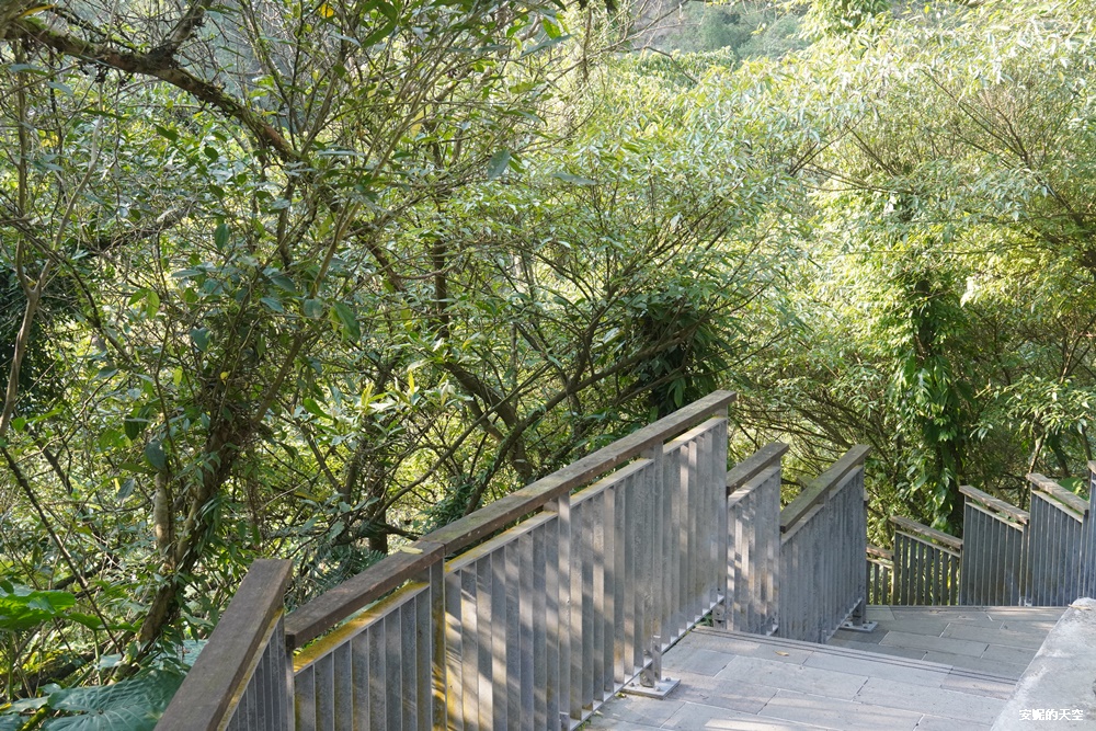 吊橋的盡頭銜接著一段階梯步道,沿著石階緩緩而下,四周被蓊鬱的林木層層包圍,一側是碧綠清澈的溪水靜靜流淌,映照著山谷的倒影,空氣裡瀰漫著濕潤的森林氣息。