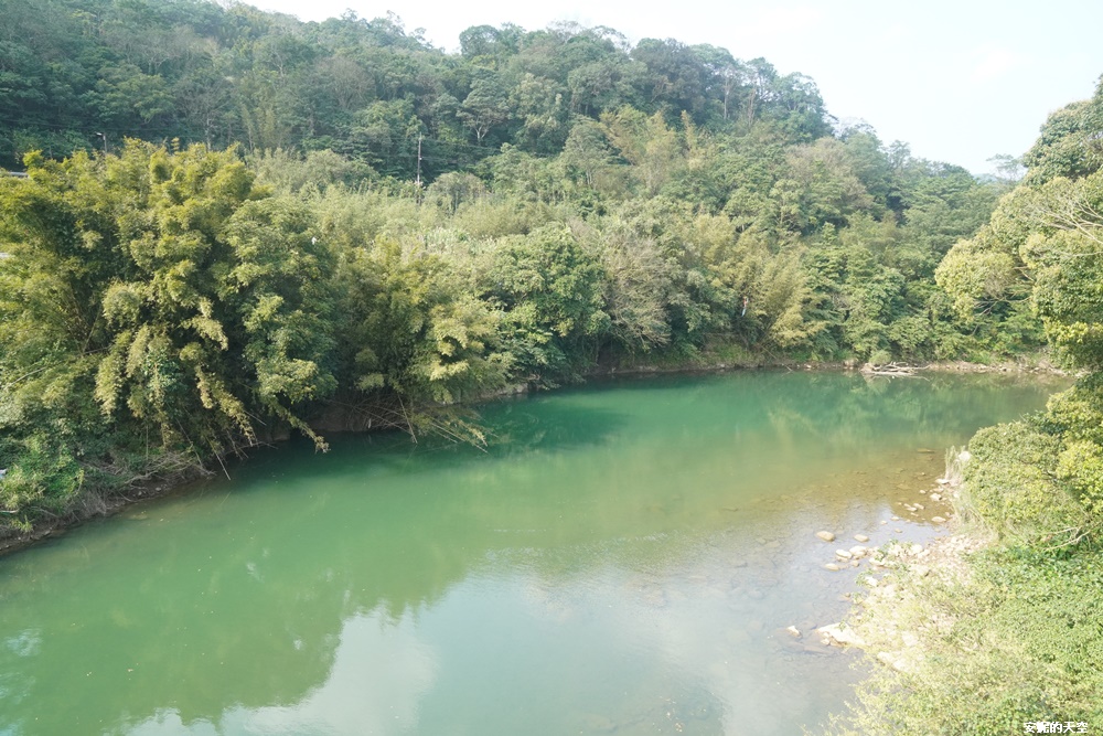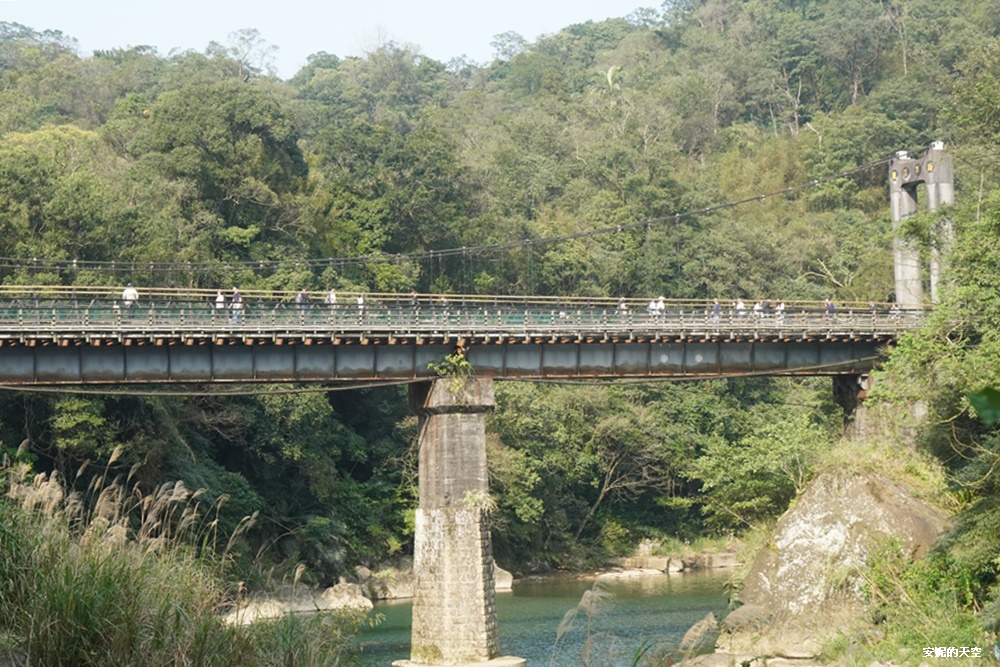 從十分車站到十分瀑布,會經過兩座吊橋,第一座吊橋【四廣潭吊橋】位在【十分幸福咖啡館】後方,吊橋橫跨基隆河支線溪流,整片溪水是夢幻的翠綠色,像是延伸至森林裡,走在橋上,可以俯瞰碧綠溪水與山谷岩壁,是一段走起來輕鬆的吊橋。