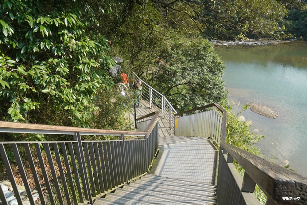 吊橋的盡頭銜接著一段階梯步道,沿著石階緩緩而下,四周被蓊鬱的林木層層包圍,一側是碧綠清澈的溪水靜靜流淌,映照著山谷的倒影,空氣裡瀰漫著濕潤的森林氣息。