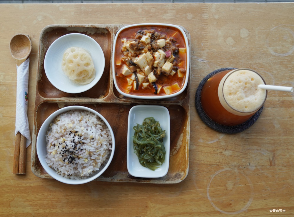 這道麻婆豆腐很特別的是植物肉,素食者可以食用,雖然是素食,口味上偏辣,但非常好吃,通過我們一致認可,搭配五穀飯也太美味了。