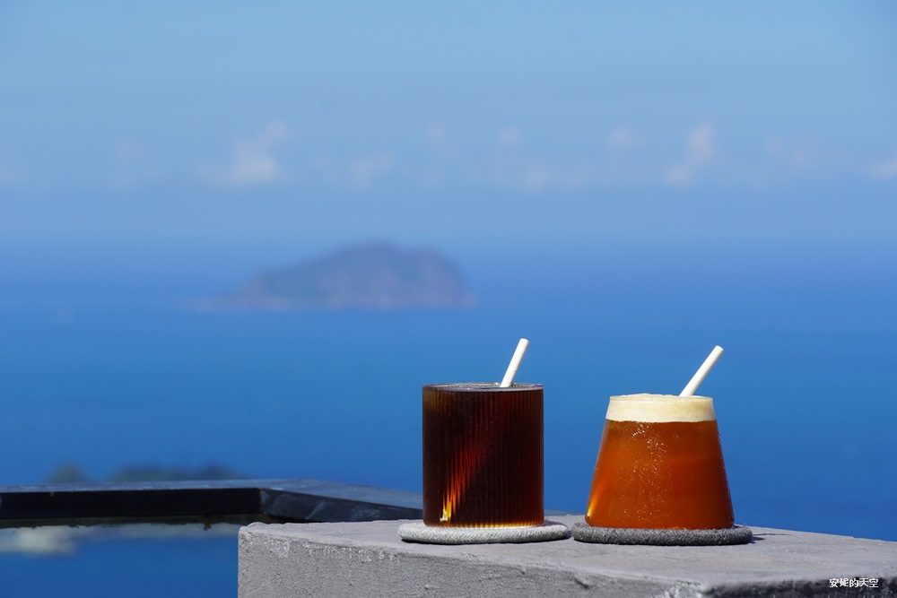 用富士山造型的茶杯盛裝,端起來的瞬間就已經充滿儀式感。在這裡喝茶、遠望著海面上的基隆嶼,整片視線都被藍色海洋填滿,療癒感滿分。