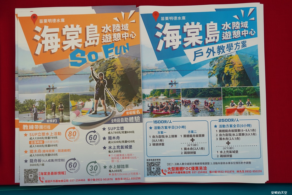 喜歡水上活動的朋友,很推薦來苗栗玩,海棠島推出許多水陸遊憩的方案,多樣水上設施一次滿足:sup立槳、獨木舟、水上充氣城堡、魔毯划水體驗、自力造筏挑戰等等,全程都有專業教練指導,全年無障礙開玩,還可以客製化團體體驗行程。