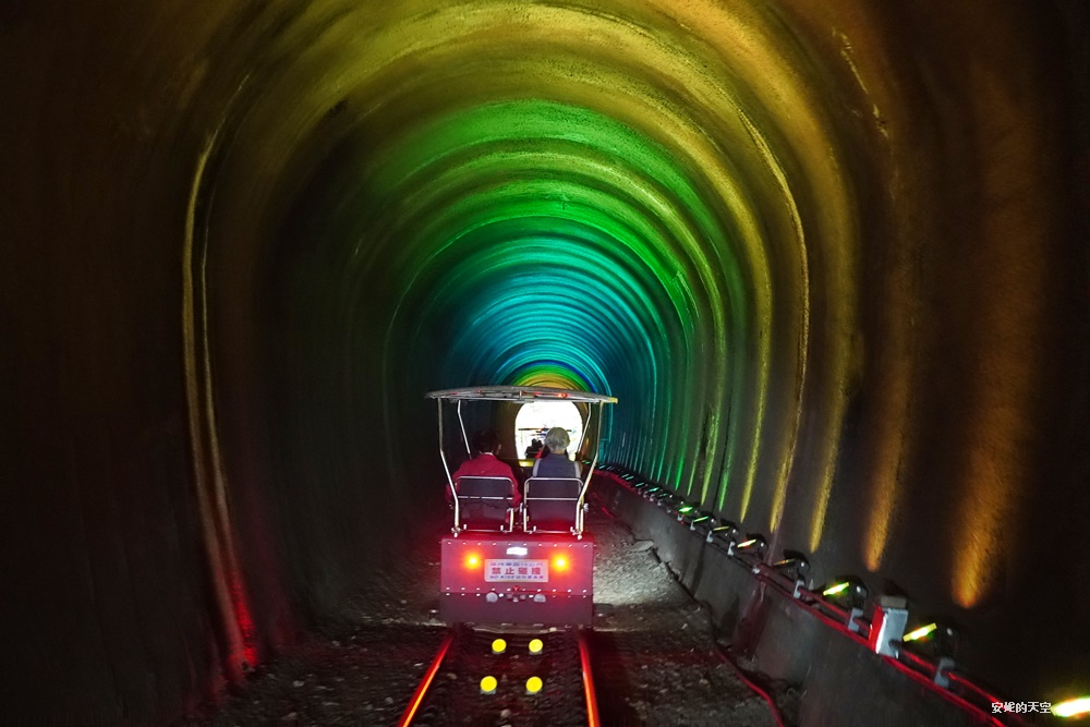 行經隧道群,被裡面魔幻的七彩光給震撼住,整個隧道呈現迷離奇幻的空間感,這段隧道大約需行駛2-3分鐘,一路的光影投射相當精采,感覺好像進入了時空隧道。