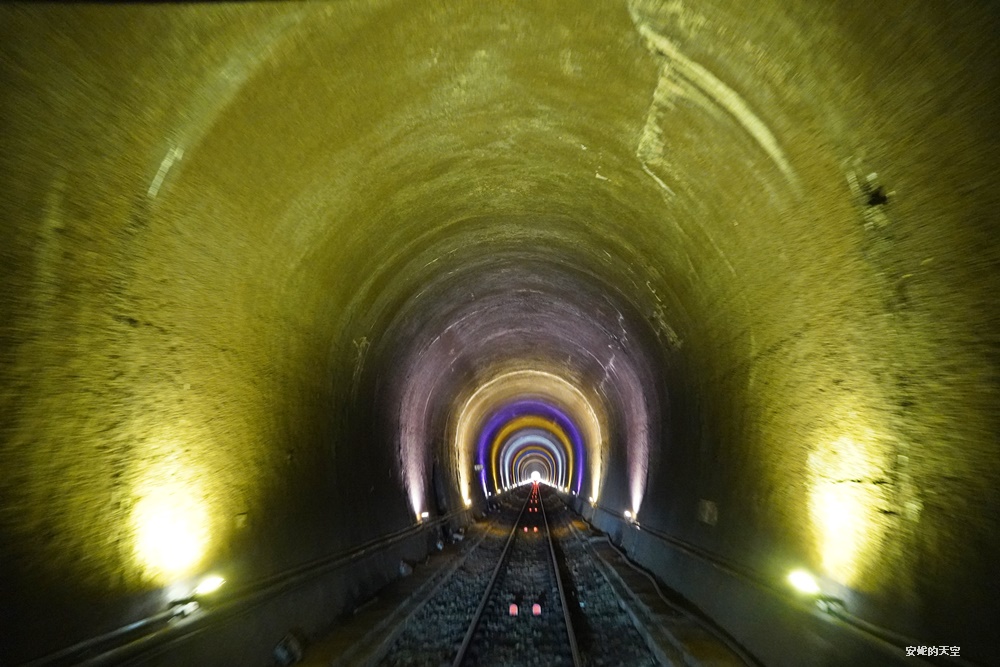 行經隧道群,被裡面魔幻的七彩光給震撼住,整個隧道呈現迷離奇幻的空間感,這段隧道大約需行駛2-3分鐘,一路的光影投射相當精采,感覺好像進入了時空隧道。