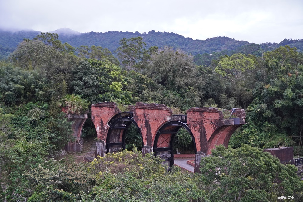 在橋上往左邊看過去,居高臨下的龍騰斷橋巍巍聳立,整座都是以磚頭砌成的龍騰斷橋,從日據時代就建立的建築,經過了大地震,也經過了修復,龍騰斷橋依舊是苗栗最熱門的景點,距離地面高度50公尺,以往來苗栗旅行只能從地面欣賞,現在可以居高臨下欣賞龍騰斷橋,這一幕真的讓人感動。
