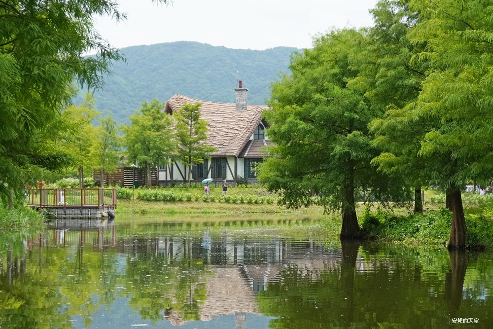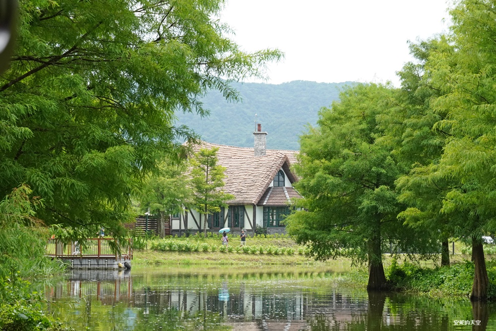 意外發現拉長長焦拍攝,更能捕捉到建築的細節,不規則的屋瓦屋頂,以及夢幻的貓眼窗戶,還有長長的煙囪,置身如山景與落羽松之間,唯美得好不真實。