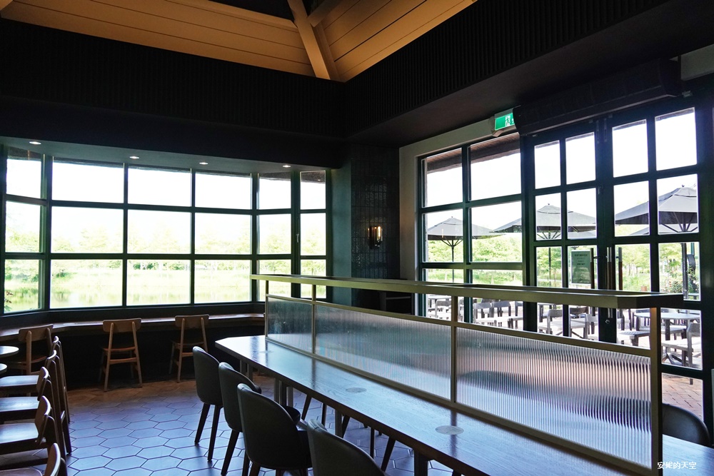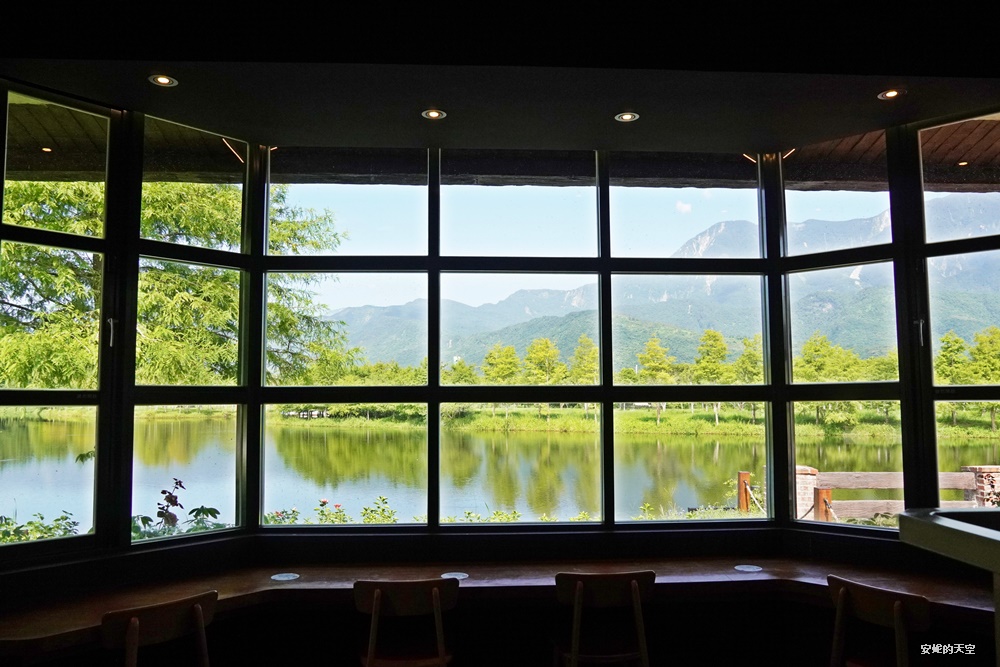 這面窗的座位區是我最喜歡的空間,可以面向湖面,將山景、湖景、落羽松景色完整收進眼裡。