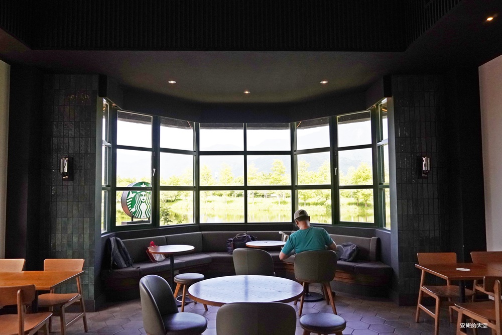 星巴克花蓮理想門市的室內空間相當寬敞,地面鋪設著優雅的六角形磁磚,搭配溫潤質感的座椅,營造出舒適放鬆的氛圍。座位數量充足,無論是想室內吹冷氣,還是選擇戶外親近湖光山色,都能找到理想位置。