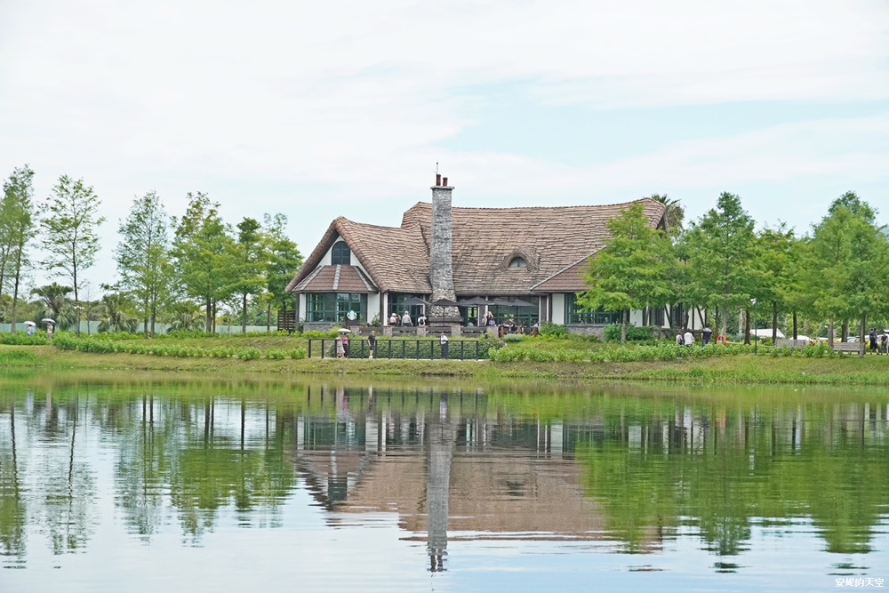 從這個角度望過去,星巴克靜靜藏身在湖水與落羽松林之中,倒映在水面的建築,如夢似幻,美得像幅畫。