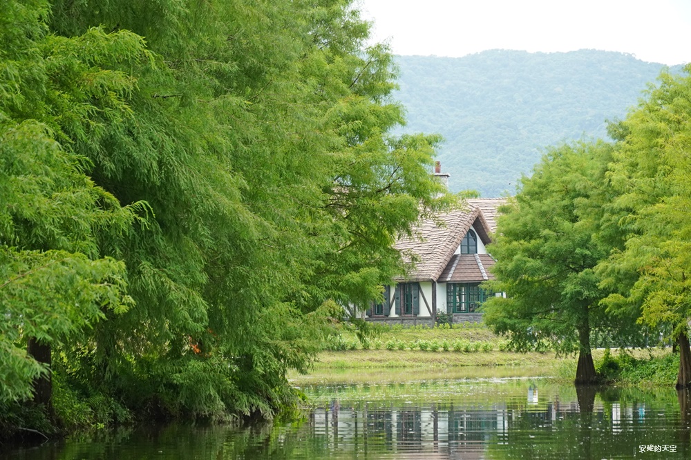 意外發現拉長長焦拍攝,更能捕捉到建築的細節,不規則的屋瓦屋頂,以及夢幻的貓眼窗戶,還有長長的煙囪,置身如山景與落羽松之間,唯美得好不真實。