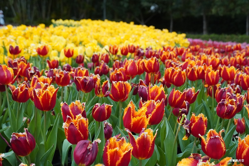 色彩繽紛的鬱金香鋪展在整個園區,像是一幅流動的春日畫布。大片花海層層交織,紅、黃、粉、紫在陽光下閃耀,怎麼拍都美。