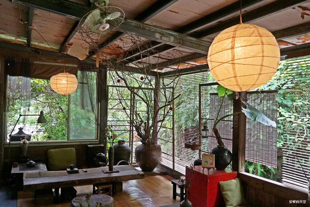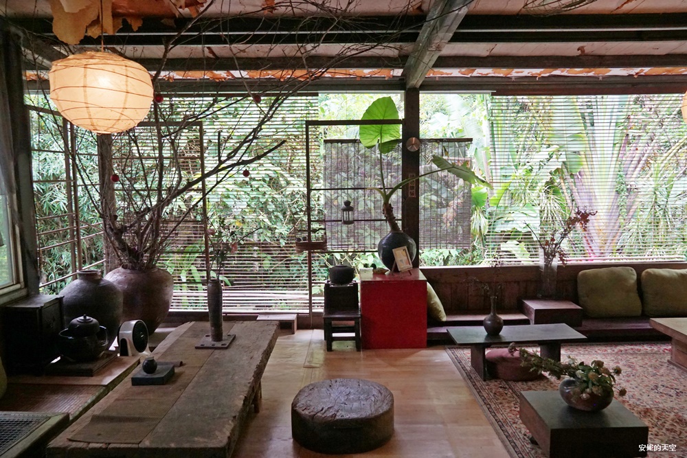 店主因為喜歡觀音與荷花,而將這個私宅秘境取名為【觀荷】,這樣清新脫俗的店名與視線所及的空間擺設真的相當呼應,店家空間充盈無可計數的古物收藏,以及充滿情調的擺設,百葉窗框住戶外的綠意,像是置身在世外桃源的森林裡,斗大燈籠流瀉溫暖的光暈,幾張木桌、地毯、抱枕,交織無比慵懶的座位空間,讓一踏入觀荷的我們,不禁驚呼這裡太美了。