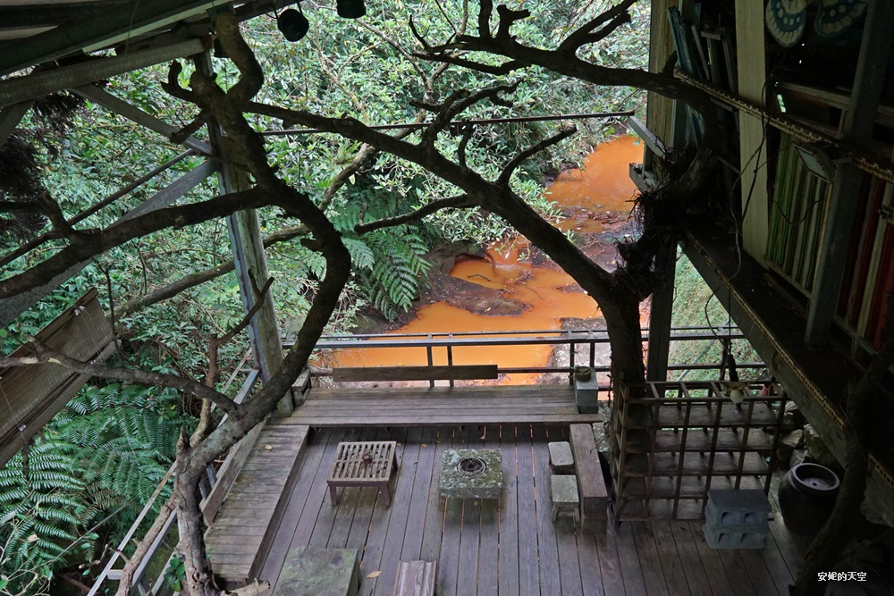 由上俯瞰,那蜿蜒如金的溪流靜靜穿梭其間,溪畔兩側,蕨類與繁茂的樹木層層交織,通透沒有遮攔的木製茶屋,坐落於溪流之上,沒有任何擺設,只有簡單的石桌與鐵桌,不加修飾的與溪流相依,是我這天最喜歡的場域。