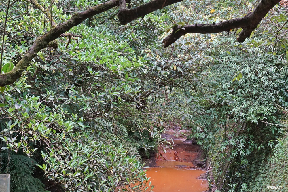 山林中的樹木有條不紊地排列生長,彷彿順應著某種自然的節奏。它們的枝影橫跨在下方金黃閃爍的基隆河上。我不確定這條溪水為何呈現這樣的色調。或許,是潛藏其中的礦物質在陽光下折射出的特殊光澤。