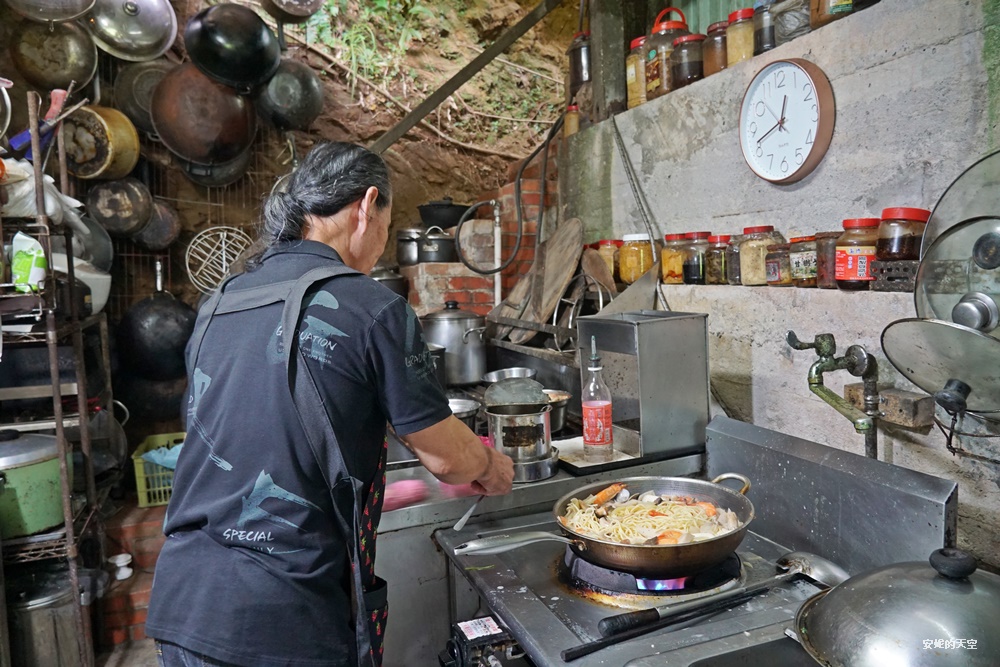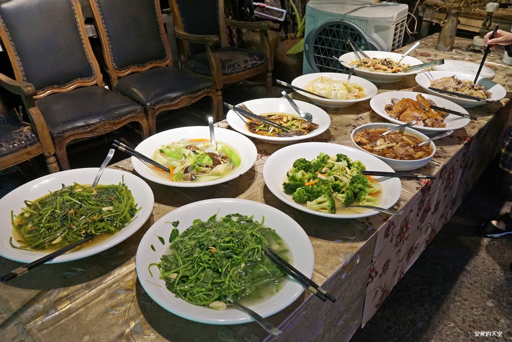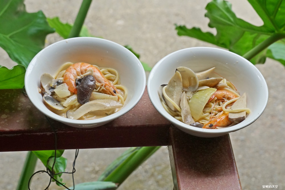 十道料理裡除了白醬海鮮義大利麵外,還有燻雞、油雞、控肉、紅燒魚、絲瓜香菇以及各式蔬菜,還有一大鍋好喝的竹筍排骨湯,另外還有一鍋白飯,這天大約有十多位預約的食客一起用餐,大家都吃超飽,也讓我對這樣的用餐方式感到新奇呢。
