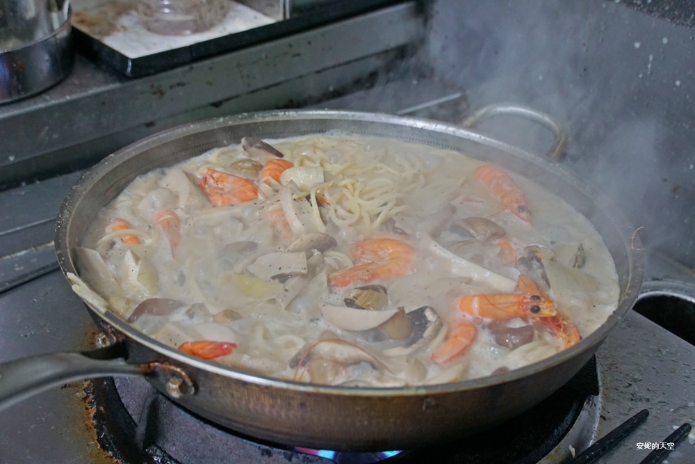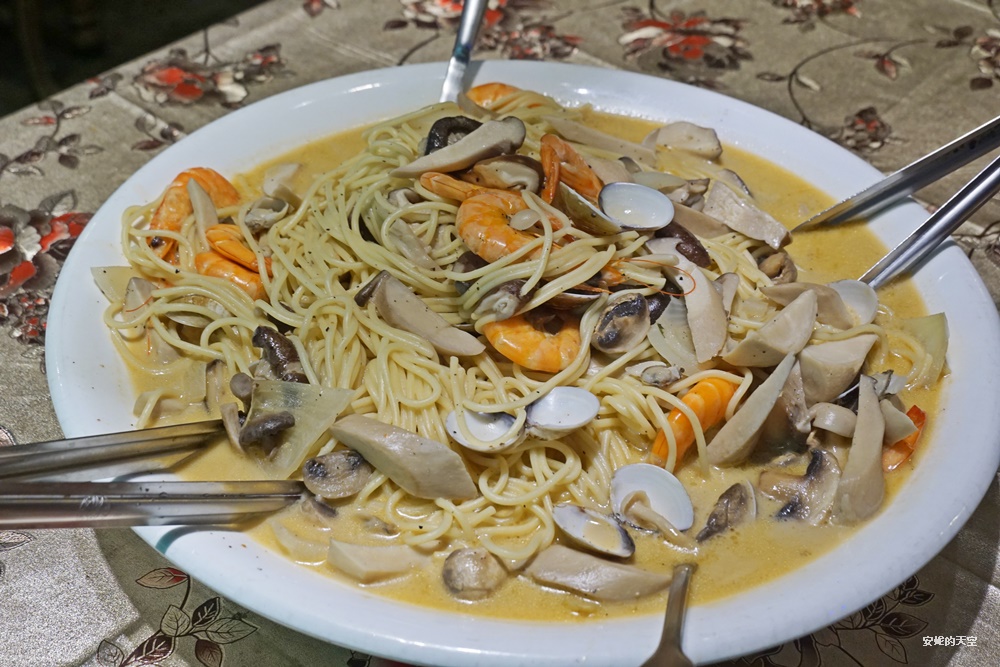 這道白醬海鮮義大利麵是店家招牌,白醬很濃郁,海鮮、菇類、蔬菜配料超多,是一道讓人吃過就難以忘懷的味道。