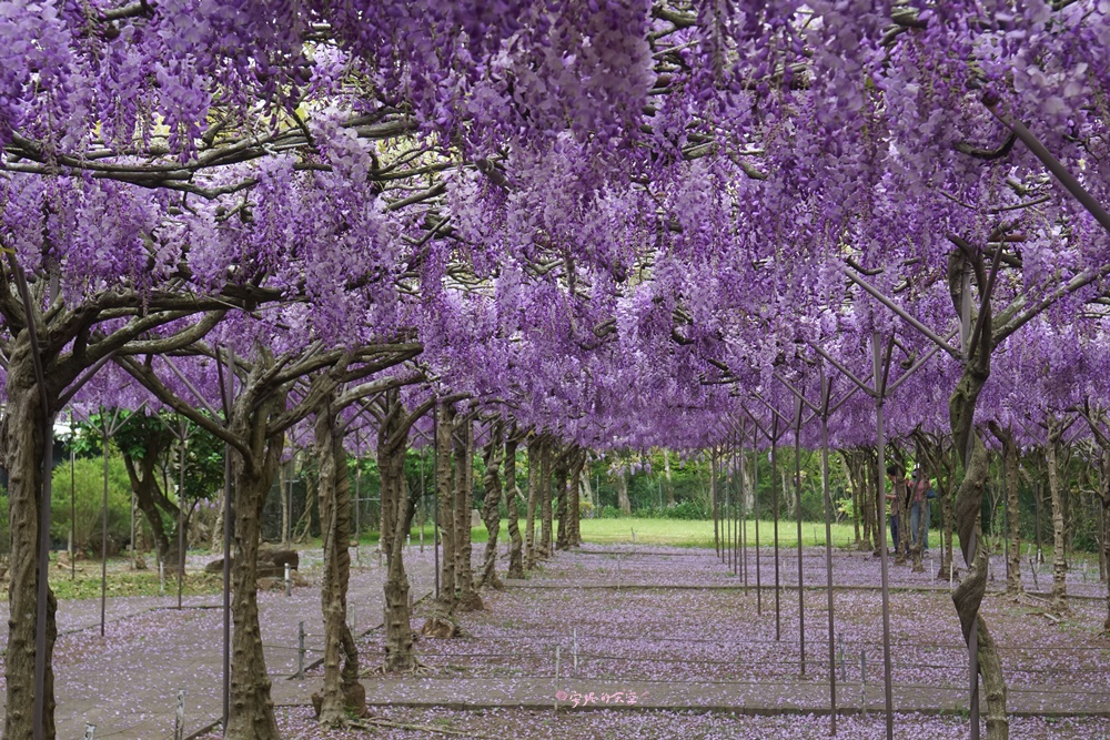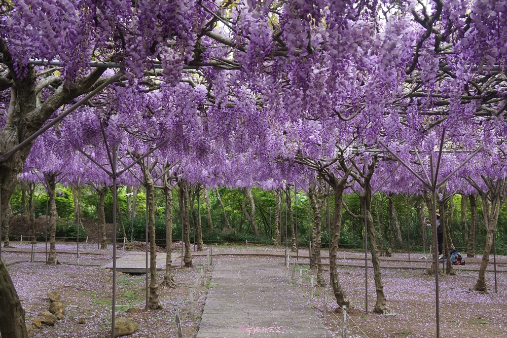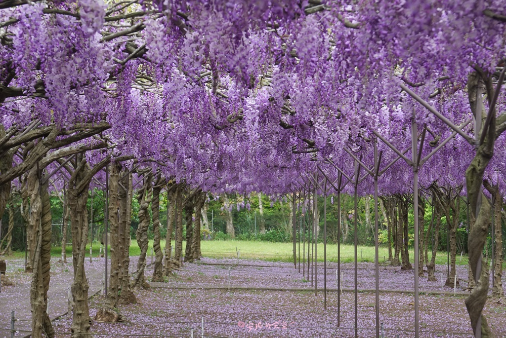 一入園這裡的紫藤花棚數量最多,花也最為密集,除了一簇簇的紫色花串,連地上也鋪滿了紫色花瓣,超級夢幻的啊!