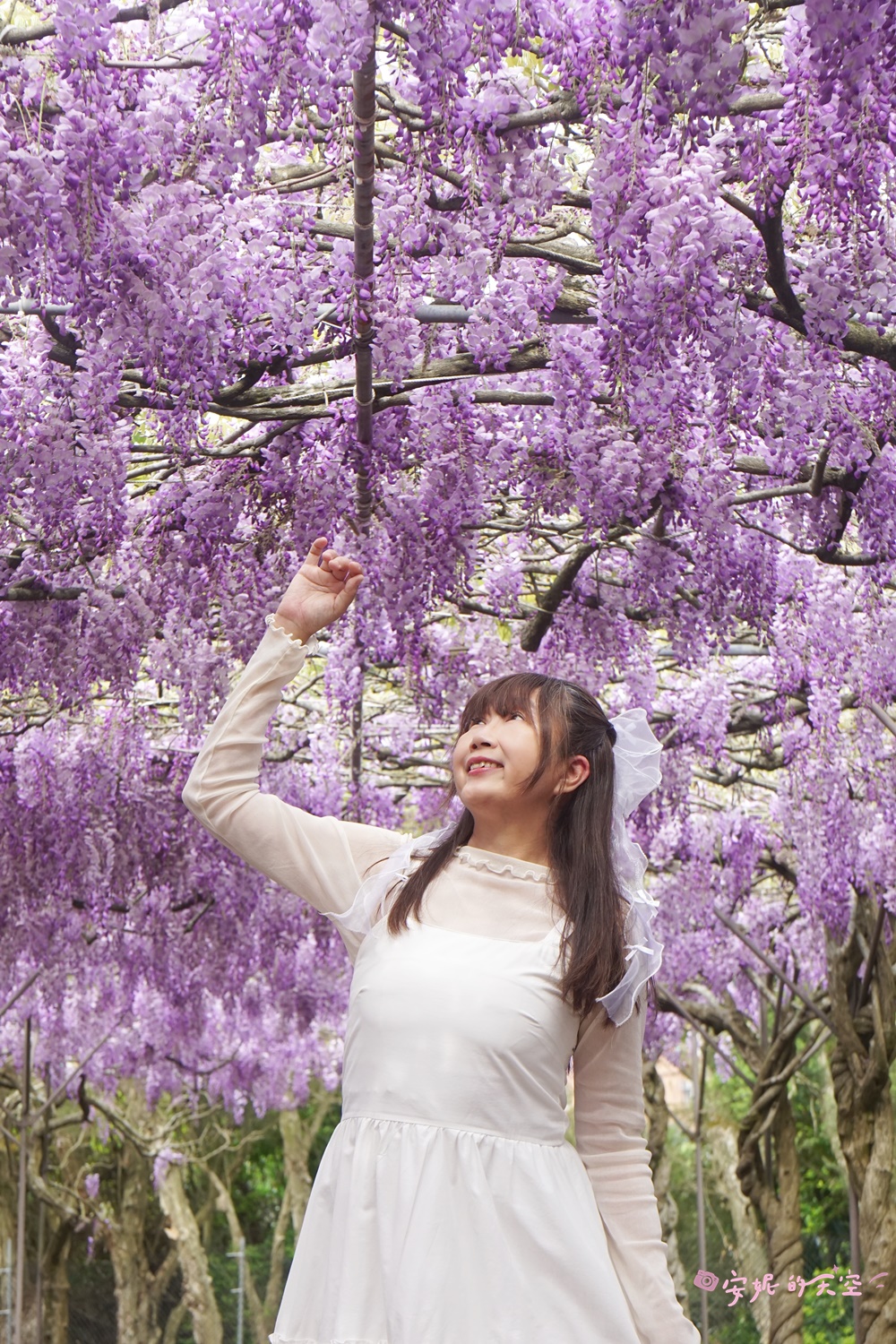 建議可以站在花園的外圍,拉長焦拍攝人物,像是置身在紫藤花隧道之間,超喜歡這樣的構圖。