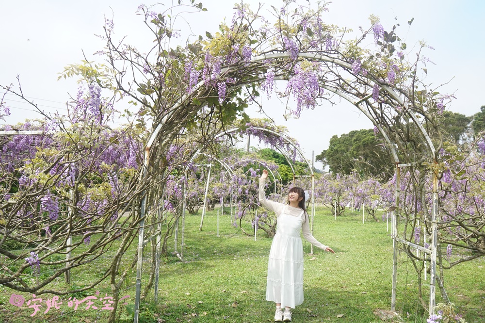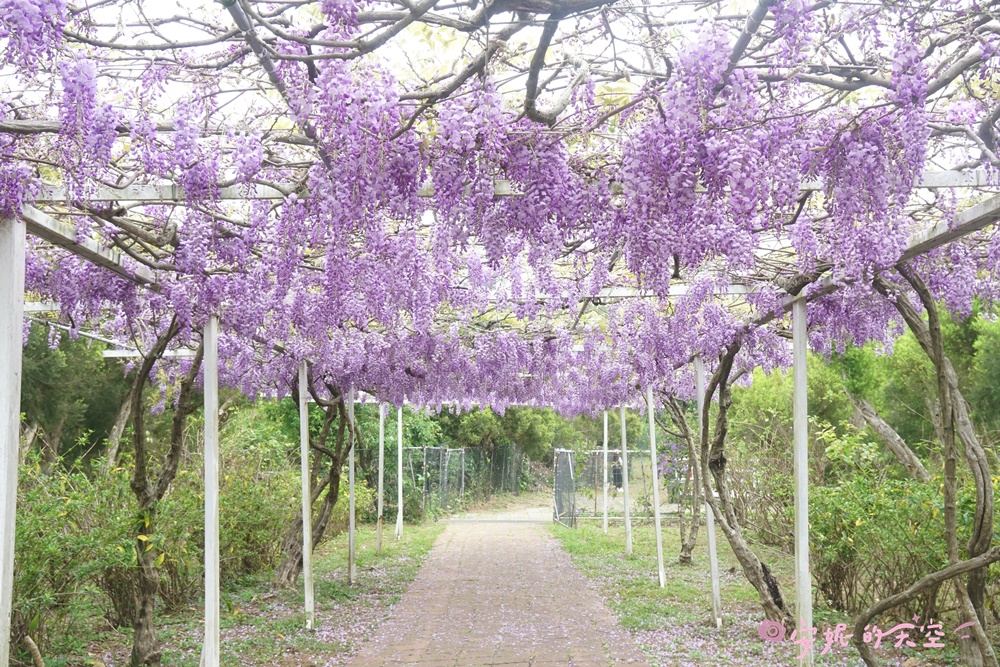 這裡的拱門紫藤隧道好夢幻啊!一簇簇紫藤蔓開在拱門的花架上,連綿不絕的紫藤花之隧道,像走進童話繪本裡的感覺呢。