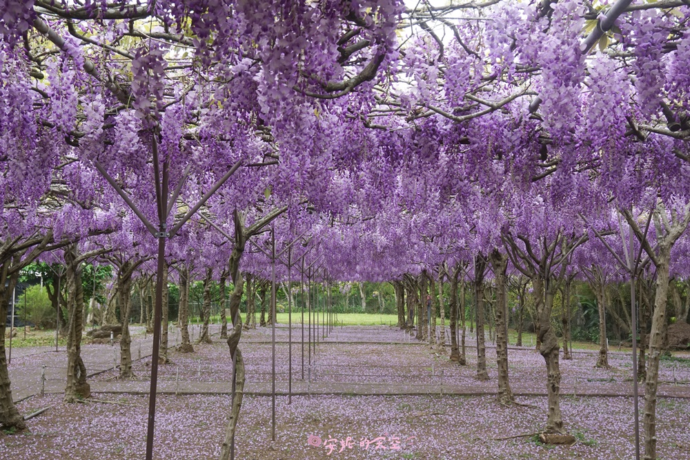 一入園這裡的紫藤花棚數量最多,花也最為密集,除了一簇簇的紫色花串,連地上也鋪滿了紫色花瓣,超級夢幻的啊!