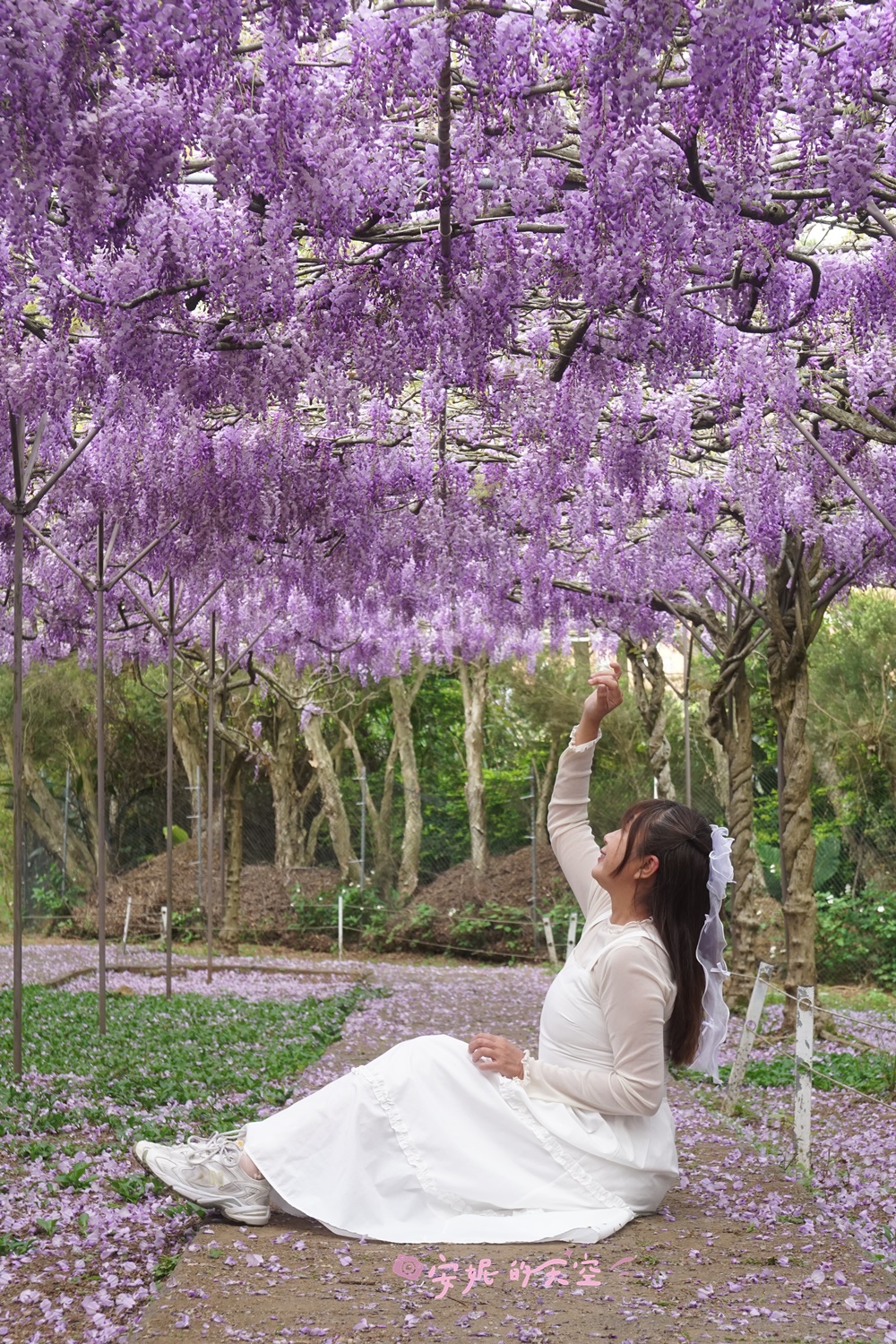建議可以站在花園的外圍,拉長焦拍攝人物,像是置身在紫藤花隧道之間,超喜歡這樣的構圖。