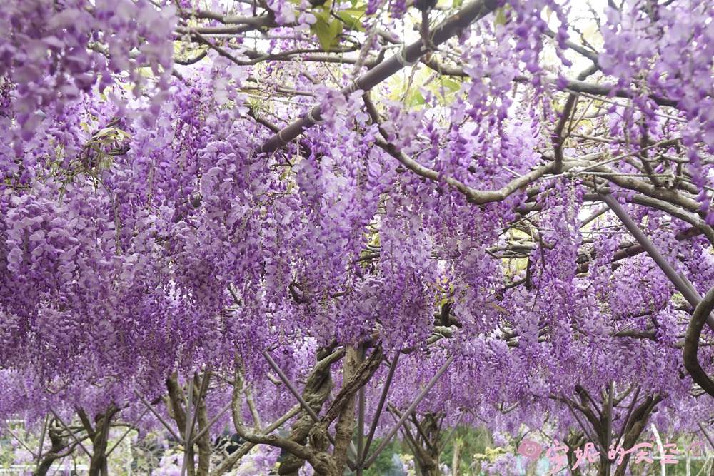 終於來朝聖全台最大的紫藤花園,一走進園區,便被滿滿的紫藤花瀑包圍,這裡有上千株的日本紫藤,園區很貼心,滿開的時候才會開放,讓旅客一走進,便能感受到紫藤花的春意盎然。